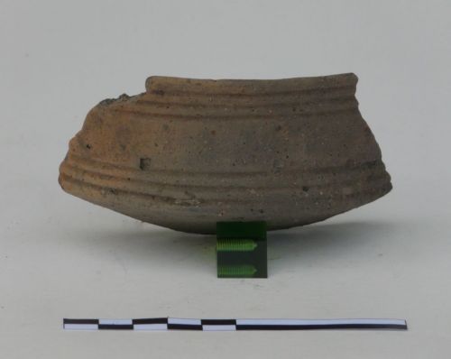 tazza carenata con orlo liscio, parete superiore leggermente concava, vasca emisferica, fondo lacunoso. E' decorata sulla parete e sulla vasca da un motivo a solcature(fasci orizzontali di linee)