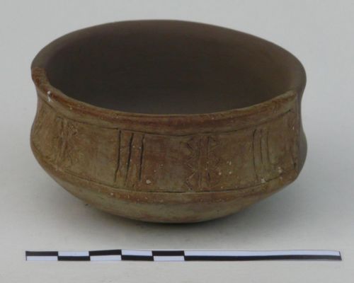 tazza carenata con orlo liscio, parete superiore concava, vasca emisferica, fondo ombelicato. E' decorata sulla parete da un motivo ad incisione (fascia orizzontale campita da fasci di linee verticali e a zig-zag)