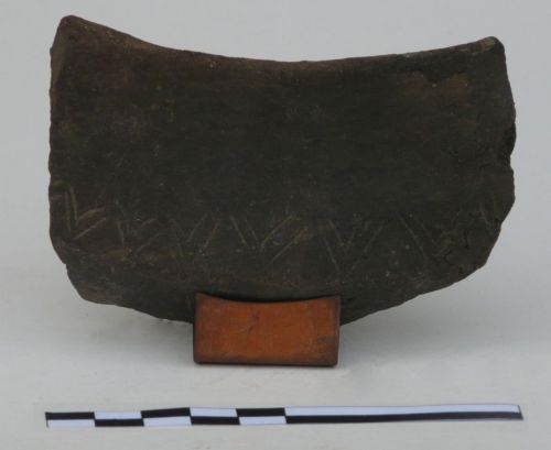 tazza carenata con orlo liscio, parete superiore diritta e vasca emisferica, decorata subito sopra la carena da una fila orizzontale di triangoli contigui, incisi