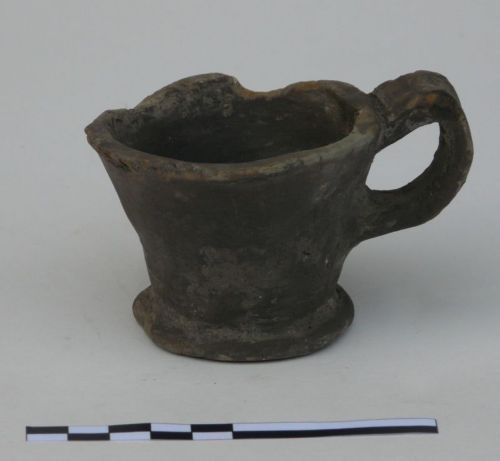 bicchiere con orlo liscio, corpo troncoconico, fondo piatto a tacco e ansa a nastro verticale , leggermente sopraelevata,impostata subito sotto l'orlo sulla parete