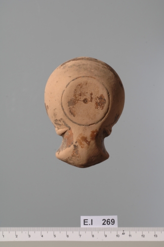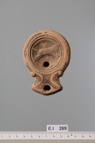 Lucerna con spalla decorata da due circonferenze incise e due cordoli di dimensioni diverse (IVa). Sul disco concavo è presente un ariete che corre a muso basso verso destra con le zampe anteriori sollevate. Sotto il motivo decorativo abbastanza consunto e poco leggibile nei particolari è presente l'infundibulum. La base piatta è delimitata da una circonferenza incisa e presenta al centro un cerchietto impresso.Corpo ceramico rosato con tracce di vernice rosso bruno opaca.