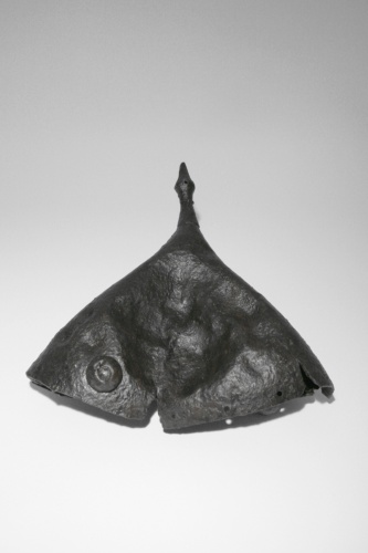 elmo a calotta con profilo conico; alla sommità, rafforzata da un tondo in ferro, è inserito e ribattuto dall'interno, un perno con puntale fusiforme ornato da un motivo a torciglione; analogo motivo appare anche lungo il margine della lamina di rinforzo, munita di tre fori, forse originariamente riempiti da smalti. Nella parte posteriore sono presenti 4 fori equidistanti per l'attacco della cerniera del paranuca. Su entrambi i lati, borchioni emisferici sono saldati alla base della calotta mediante un chiodo, funzionale al fissaggio dall'interno della laminetta (conservata solo su un lato) di sostegno dei paraguance.