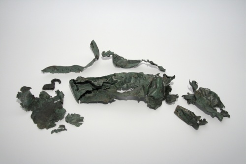 si tratta di frammenti pertinenti quasi sicuramente ad un unico vaso, alquanto deformati, in lamina molto fragile e frastagliata. Il pessimo stato di conservazione non consente di determinarne con certezza la tipologia; tuttavia, come si desume dall'analisi dei frammenti di dimensioni maggiori, appartenenti al corpo del vaso, e meglio conservati, potrebbe trattarsi di una situla di tipo tardo, ad orlo diritto, leggermente ispessito, munita di manico; su un frammento si conserva, infatti, parte di una placchetta in ferro fissata alla lamina da un ribattino anchesso in ferro, forse pertinente allattacco di un manico. Si osservano numerosi interventi di restauro antico, con rinforzi applicati mediante ribattini a testa piatta.