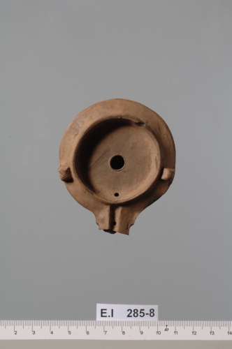 esemplare con spalla estroflessa su cui sono presenti due borchiette piramidali, lievemente spostate verso il basso. Il disco liscio e ribassato, circondato da un alto bordo, reca un infundibulum centrale e un piccolo forelino di sfiato. Sul canale è presente un secondo foro di sfiato. La base, delimitata da due circonferenze impresse, reca il marchio di fabbrica COMMVNIS. Corpo ceramico depurato giallo rosato con ingobbio.