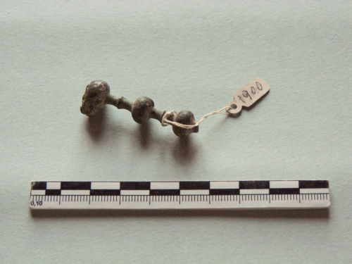 Frammento di spillone a capocchia a globetti alternati a costolature mediane singole.