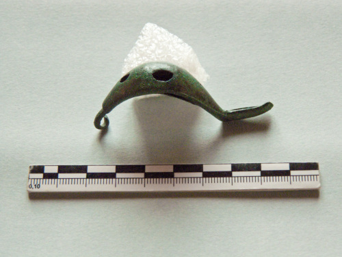 Fibula a sanguisuga ad arco rigonfio, staffa lunga e molla a doppio avvolgimento.