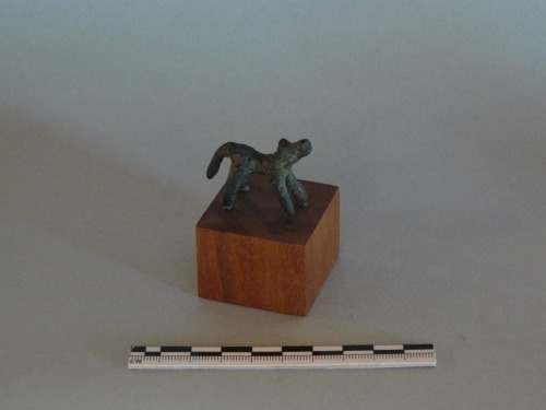 Bronzetto di cane caratterizzato dal muso allungato e piccole orecchie, groppa inarcata, zampe divaricate e lunga coda.