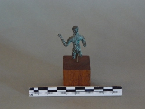 Bronzetto di guerriero in assalto, la testa ha profilo subcircolare, i tratti del volto non sono segnati. Il corpo è trattato in maniera sommaria, braccio destro piegato forse originariamente doveva essere fissata la lancia e le gambe risultano leggermente divaricate.