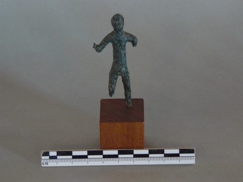 Bronzetto di guerriero in assalto,la testa ha profilo subcircolare, i tratti del volto non sono segnati. Il corpo è trattato in maniera sommaria, braccio destro è piegato e originariamente doveva essere fissata la lancia; i genitali sono indicati da una leggerea protuberanza e le gambe risultano leggermente divaricate.