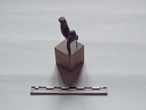 Il bronzetto rappresenta una figura di acrobata che esegue l'esercizio della verticale. La testa è a profilo subcircolare, presenta una benda (taenia) con capelli che ricadono indietro lasciando scoperte le orecchie, tratti del volto sono poco visibili per la corrosione. I tratti del viso sono appenna accennati e risulta vestito con un perizoma.