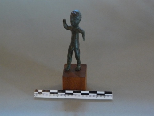 Bronzetto di guerriero stante con il capo a profilo subcircolare, di dimensioni maggiori rispetto al resto del corpo, i capelli sono stati realizzati mediante incisioni subcircolari. Il volta presenta grandi occhi, naso appuntito e labbro a cordoncino. Sul braccio destro si individua l'incisione su cui dovevav essere fissata originariamente la lancia. Il resto del corpo risulta tozzo e i genitali sono accentuati.