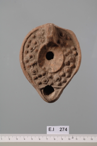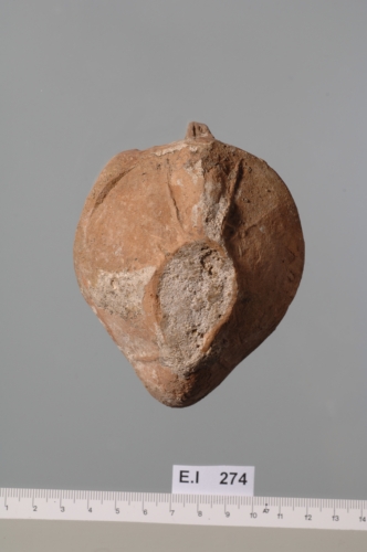 l'esemplare, a corpo ovale, è composto da una metà inferiore ad alta parete troncoconica, rastremata verso la base e da una parte superiore con una spalla decorata da tre file di bugnette a volte circondate da una circonferenza in rilievo, disposte in modo irregolare. L'ansa, impostata verticalmente, è forata. Il disco ribassato è circondato da un cordolo in rilievo e presenta un motivo decorativo di difficile lettura, interpretabile forse come una corolla di quindici petali roteanti intorno all'infundibulum centrale. La base ovale è delimitata da una modanatura da cui partono tre nervature che sottolineano la parte sottostante l'ansa. Altre due sottolineano la parte inferiore del becco. Corpo ceramico depurato bruno rosato.