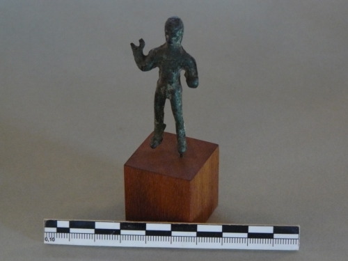 Bronzetto di guerriero stante, testa ha profilo subcircolare, è priva dei tratti del volto. Il corpo è trattato in maniera sommaria, il braccio destro termina ad anello cui doveva essere infilata originariamente la lancia. Il resto del corpo risulta tozzo e i genitali sono accentuati.