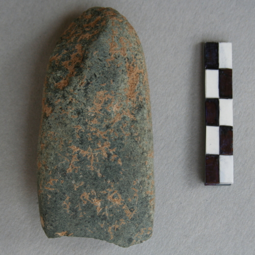 Ascia frammentaria in pietra levigata, di forma subtriangolare e con taglio fratturato. Litologia di bassa qualità e di probabile origine locale.