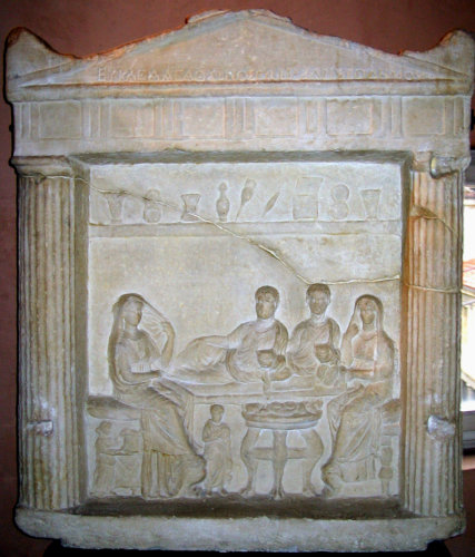 due figure maschili adagiate su una kline, due figure femminili (una a destra, una a sinistra) sedute su un sedile, una mensa con offerte innanzi alla kline, un inserviente a sinistra della mensa e, di fronte al sedile della figura femminile di sinistra, un'ancella