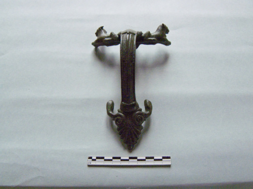 Grande ansa a nastro di oinochoe decorata alle due estremità da una coppia di leoni, in cui sono stati particolarmente messi in risalto gli occhi, i baffi e la criniera. Tra i due leoni è poi inserite una testa di leone, più grande dei precedenti, i cui particolari sono stati resi a bulino. L'ansa a nastro risulta piatta nella parte interna, mentre il dorso presenta sezione subtriangolare, decorata da una costolatura centrale e da due più piccole laterali. L'attacco dell'ansa è costituito da una palmetta a nove foglie, inserita tra due protomi stilizzate di serpente.