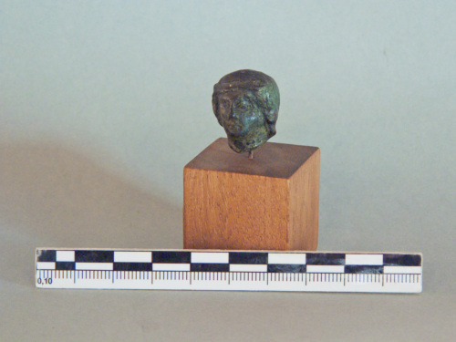 testa di figura femminile con testa a profilo subcircolare, sembra indossare una cuffia e la fronte è cinta un ornamento a fascia. Il volto presenta occhi e palpebre a rilievo, il naso e la bocca sono piccoli e resi a rielivo, il mento è arrotondato.