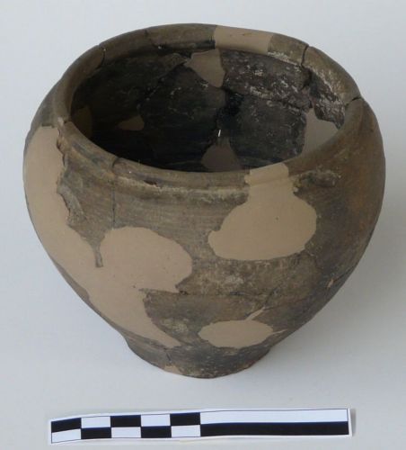 breve labbro diritto, distinto. Corpo ovoide con diametro massimo nel terzo superiore; fascio di solcature sulla spalla