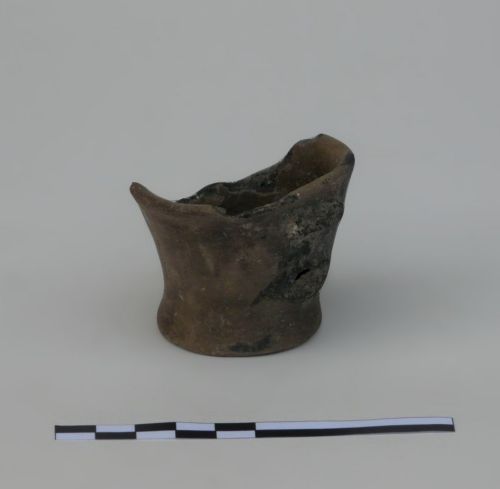 bicchiere con orlo liscio leggermente estroflesso, corpo troncoconico, fondo piatto a tacco e attacco d'ansa a nastro verticale impostata sotto l'orlo sulla parete