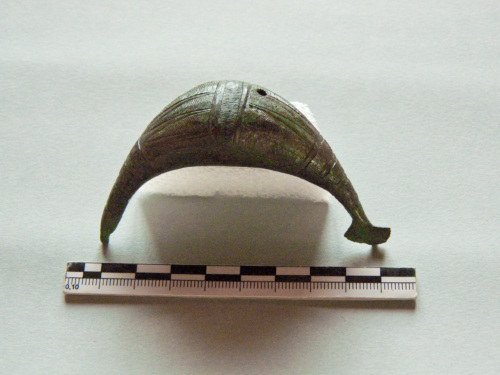 Fibula a sanguisuga decorata da una fascia verticale campita da un motivo a spina di pesce, serie di fasce orizzontali campite con il medesimo motivo; priva di staffa e di ago.
