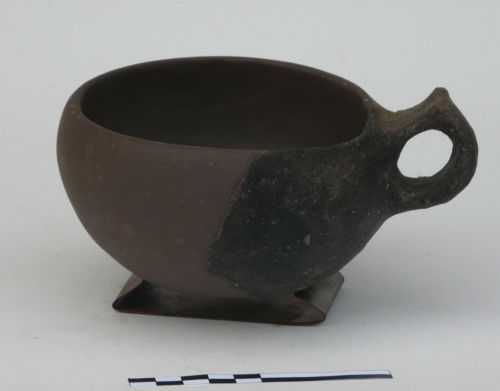 tazza a profilo non articolato, con orlo liscio, parete emisferica, fondo convesso, ansa con sopraelevazione ad ascia impostata subito sotto l'orlo