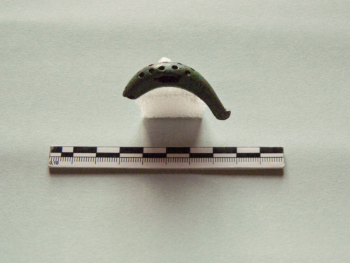 Arco di piccola fibula a sanguisuga, sull'arco presenta forellini che originariamente dovevano contenere elementi in pasta vitrea o altro materiale.