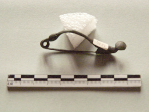 fibula tipo Certosa con arco asimmetrico e disco fermapieghe.