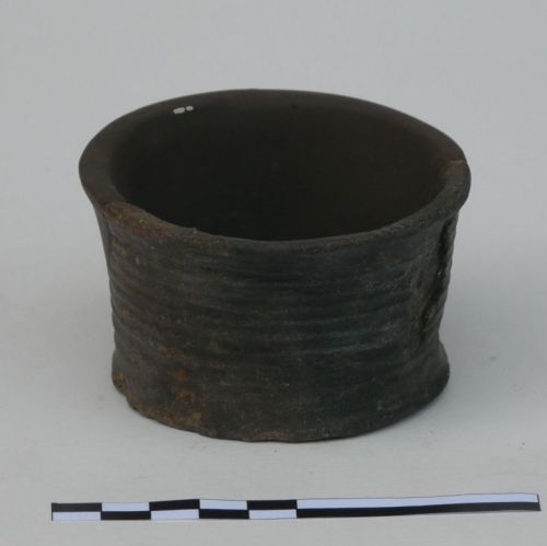 bicchiere con orlo liscio cordonato esterno, corpo troncoconico, fondo piatto a tacco e attacco d'ansa (integrata) piccola a nastro impostata sotto l'orlo sulla parete. Decorato sul corpo da fasci orizzontali di incisioni parallele