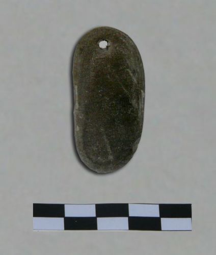 piccolo ciottolo ovale a sezione appiattita, con un'estremità forata, interpretabile come pendaglio
