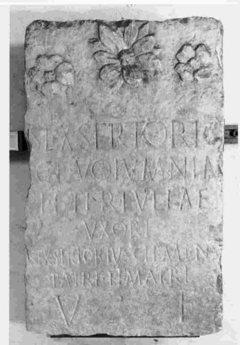 La stele presenta tre motivi decorativi floreali al di sopra dell'iscrizione. I tre fiori appaiono diversi tra loro per qualità e dimensione: il più grande è in posizione centrale, con sette petali e quattro foglioline; più piccolo è il fiore che figura a destra, quadripetalo e con bottone centrale; lievemente più piccolo e posto un po' più in alto in rapporto al corrispettivo sinistro, è il fiore sulla destra, ugualmente quadripetalo con bottone centrale. La superficie frontale, così come quella dei lati destro e sinistro, presenta una leggera lavorazione a martellina. Il retro risulta invece solo sommariamente sbozzato. L'iscrizione mostra interpunzioni di forma triangolare con punta rivolta verso il basso. Il ductus è regolare; il modulo tendenzialmente allungato. Le lettere presentano una lieve apicatura, sono incise poco profondamente e risultano a tratti quasi evanide per consunzione della pietra, specie tra le rr. 5 e 6. Si segnala inoltre una lieve tendenza della parte finale delle righe ad addossarsi lungo il margine destro della stele.