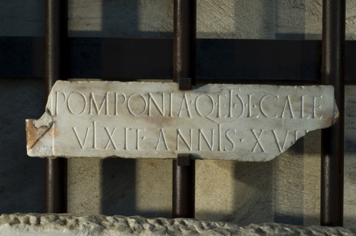 Lastra funeraria quadrangolare conformata a tabella ansata, mutila del margine laterale destro; sul lato sinistro sopravvive il foro di fissaggio fratto colmato con stuccatura da restauro. Il campo epigrafico, leggermente prominente, e le decorazioni laterali sono state ottenute mediante abbassamento della superficie circostante. La superficie della fronte è stata lisciata, lavorata a gradina e poi levigata; il retro si presenta lisciato e tagliato in modo da essere più rastremato verso lalto. Ricerca di simmetria nellimpaginazione, con tracce di linee guida; lettere apicate con ricerca dellombreggiatura: si notano occhielli delle P aperti e code delle Q molto allungate. In r. 1 presenza di lettera rovescia. Segni di interpunzione a sagitta e a semplice solco.