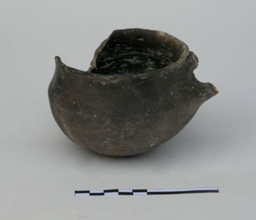 boccale carenato con orlo liscio, parete superiore concava, vasca convessa, fondo ombelicato; presenta solo l'attacco dell'ansa