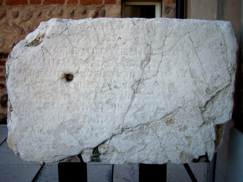 L'iscrizione è incisa in forma di epigramma, che consta di quattro distici elegiaci: dopo il rituale invito al viandante a fermarsi presso la tomba, il giovane ricorda i genitori e la patria, accennando alle circostanze della propria morte, avvenuta in un naufragio, ed alla sua sepoltura nell'isola di Scheria, ovvero a Corcira. Qui la pietra venne vista per la prima volta alla metà del XV secolo da Ciriaco d'Ancona, che la descrisse come base di statua. Nonostante in un primo tempo Ciriaco non sia stato creduto e il testo sia stato ritenuto fittizio, nel XVII secolo il ritrovamento della lapide permise di confermare la trascrizione dell'erudito anconitano.