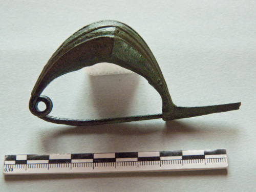 Fibula ad arco a sezione romboidale, decorato da costolature longitudinali, staffa lunga, molla a doopio avvolgimenti