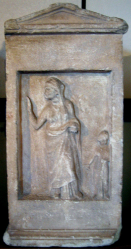 L'iconografia della figura principale si ritrova simile in una stele conservata al Museo Archeologico di Napoli (IG, XIV, 762). L'iscrizione è incisa sotto il rilievo, con lettere piuttosto grandi, a tratti sottili e poco profondi, apicati alle estremità. L'età alquanto recente dei caratteri si manifesta nella presenza dell'alpha a sbarra spezzata e del sigma con i tratti esterni paralleli, mentre l'omikron non è rimpicciolito. Qualche dubbio sorge circa il nome che segue quello della defunta: al posto dell'usuale patronimico, infatti, si trova il genitivo di un nome femminile. Si può pensare, seconda la Ritti, ad un matronimico determinato da qualche circostanza particolare, quale potrebbe essere la filiazione illegittima.
