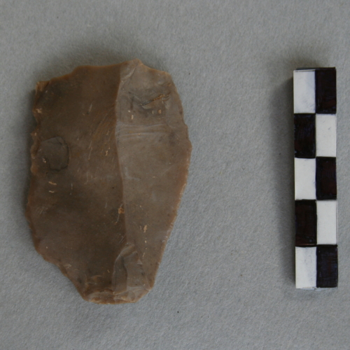 Raschiatoio foliato doppio su grande lama, a ritocco piatto marginale-invadente bifacciale margine sinistro, semplice marginale diretto margine destro.