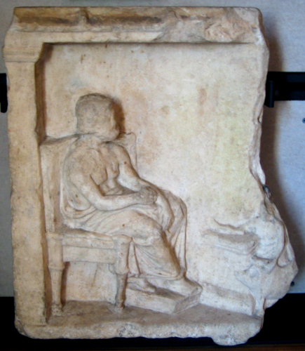 A causa della mancanza di attributi non è facile stabilire l'identità del dio raffigurato: gli studiosi hanno supposto possa essere sia Asclepio, sia Zeus Meilichios, sia una imprecisata figura eroica. Consuetudini rappresentative di Zeus Meilichios, tuttavia, espresso costantemente nella solennità del trono, con la mano sinistra appoggiata allo scettro e la destra con la phiale, inducono L. Beschi a propendere per la figura di Asclepio; anche il confronto con alcuni rilievi del Louvre sembra sostanziare tale ipotesi. Di opinione diversa T. Ritti, che, sulla base della rilevata affinità tra il pezzo in esame ed un rilievo votivo al Museo del Pireo, ritiene si tratti di Zeus Meilichios o di una figura eroica minore. Nonostante le incertezze esegetiche causate dalla mancanza di attributi in connessione con la divinità seduta, L. Beschi propende per l'identificazione con Asclepio anche sulla base delle sorti collezionistiche del pezzo. Egli infatti, dal momento che le fonti documentarie indicano una presenza del rilievo a Padova già dalla fine del XVII secolo-inizi del XVIII, sulla base dell'iconografia riferibile ad Asclepio ritiene che il pezzo possa essere stato raccolto sulle pendici meridionali dell'Acropoli di Atene in occasione delle operazioni militari e fortificatorie di Francesco Morosini. Di opinione contraria E. Di Filippo Balestrazzi, che, basandosi sul fatto che il pezzo apparteneva allo stesso gruppo di marmi di cui faceva parte il rilievo di Argenidas ai Dioscuri, ritiene possa essere stato rinvenuto ad Este.