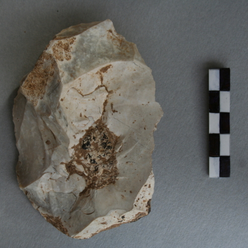 Strumento campignano a ritocco sommario bifacciale, di forma subovale, probabilmente danneggiato dallo stacco di una grossa scheggia sulla faccia dorsale.