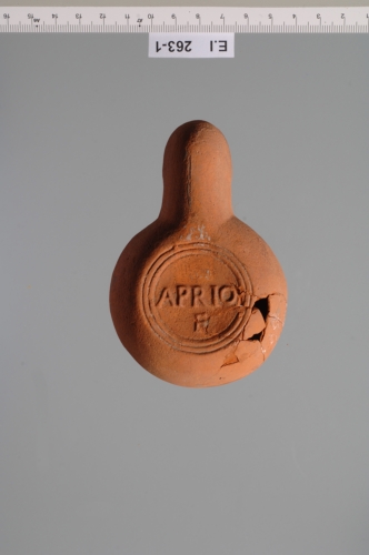 l?esemplare ha una spalla estroflessa ornata da due borchiette, il disco ribassato con infundibulum centrale e un foro di sfiato a metà del canale del becco. La base, racchiusa da due circonferenze impresse, reca il marchio di fabbrica VIBIANI con lettere in rilievo leggermente apicate.Corpo ceramico nocciola depurato. Tracce di vernice scura e annerimento dovuto al fuoco.
