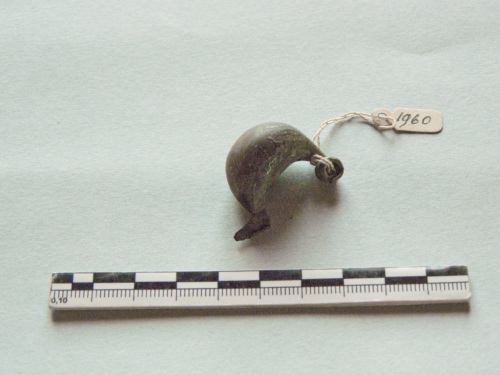 piccola fibula a sanguisuga di notevole spessore, sezione a spigolo nella zona ventrale, staffa lunga e molla a due avvolgimenti, priva dell'ago.