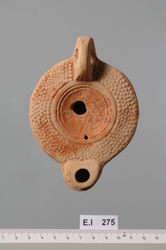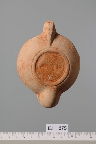 esemplare con spalla larga ed estroflessa, ornata da sei file di perline in rilievo, disco liscio e leggermente concavo in direzione dell'infundibulum decentrato in alto a sinistra, delimitato da tre circonferenze concentriche e tre cordoli in rilievo. Al limite del disco è presente un forellino di areazione di forma circolare, mentre l'ansa, impostata verticalmente e forata, è opposta al grande becco e decorata da tre linee incise. Sulla base ad anello è impresso un marchio di fabbrica difficilmente leggibile F[--]RIM(?) Corpo ceramico depurato rosato ricoperto da vernice rosso bruno-opaca.