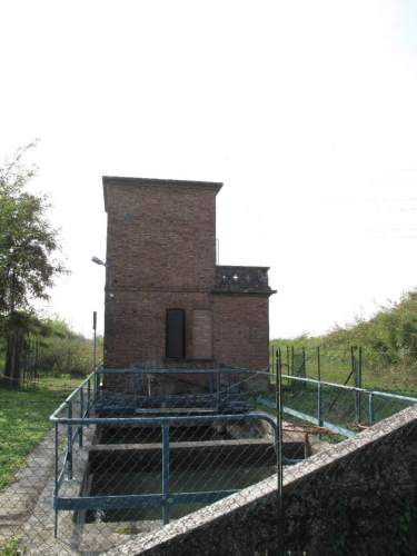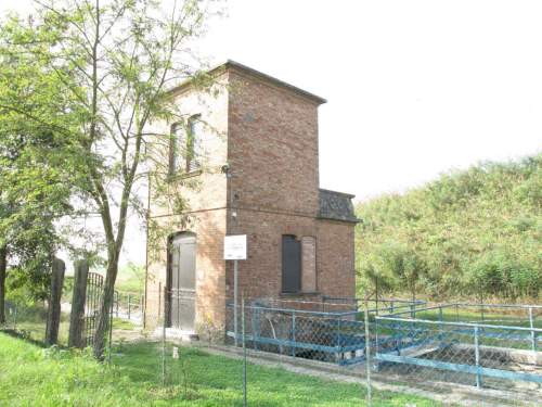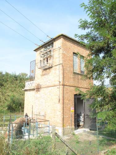 edificio a torretta a pianta quadrata a due piani, muratura continua in laterio a vista con forometria arcuata e copertuta a terrazzo. Piccolo volume addossato al corpo principale con stesse caratteristiche costruttive, presenta copertura a terrazza con parpetto decorato a losanghe.