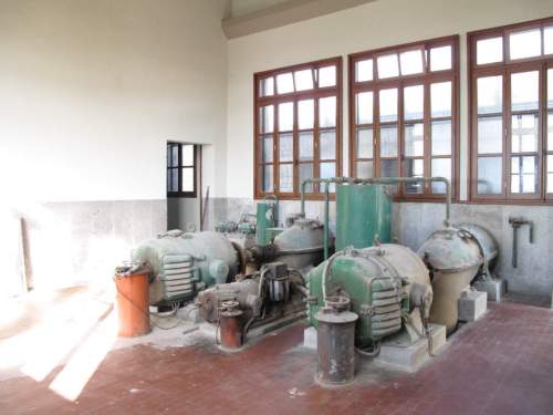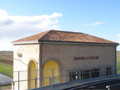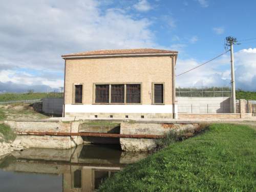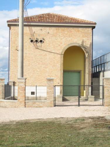 volume rettangolare ad unico vano con muratura continua in laterizio a vista, forometria regolare seriale, all'interno presenta capriate reticolari in legno, copertura a quattro falde in coppi di laterizio.