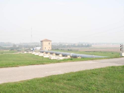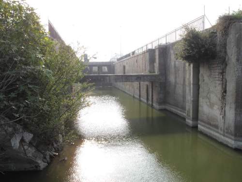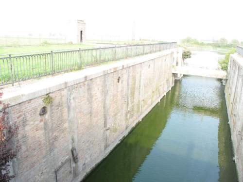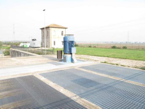 resti strutturali idraulici, compresenza di setti murali in muratura in laterizio a vista con piccola forometria circolare seriale, conclusi da copertine in materiale artificiale, presenza di un parapetto in ferro lungo i setti murali.