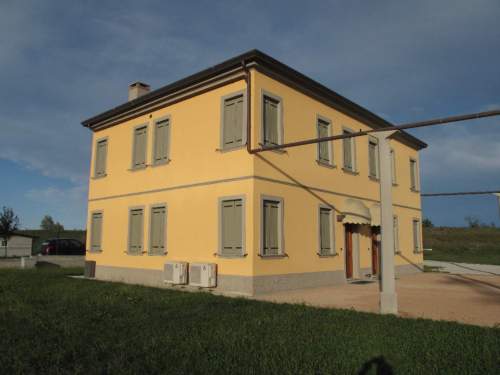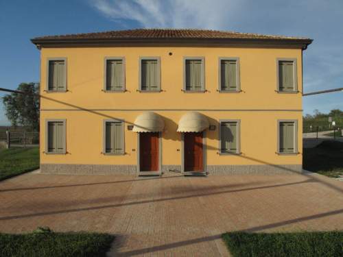 volume rettangolare con suddivisione esterna ed interna simmetrica, murature continue intoncate con forometria regolare seriale e copertura a quattro falde in coppi di laterizio.