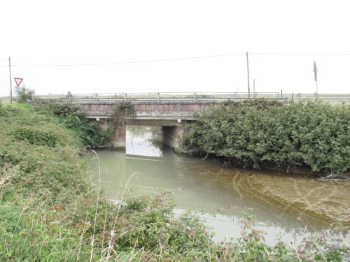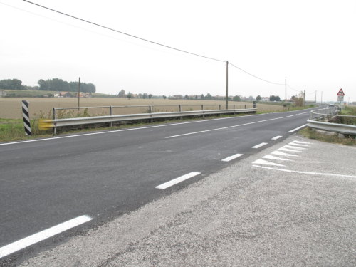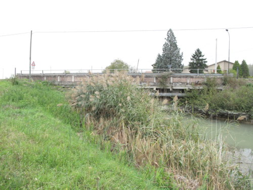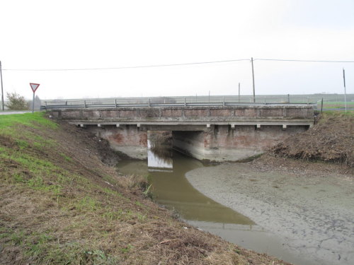 ponte in muratura e in cemento armato a canna quadra con spalle in muratura e impalcato con travi in cemento armato e parapetti pieni in muratura, copertina in cemento armato e guardrail.