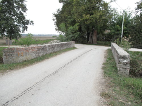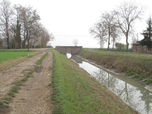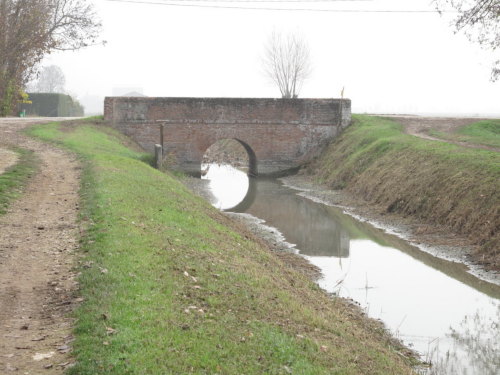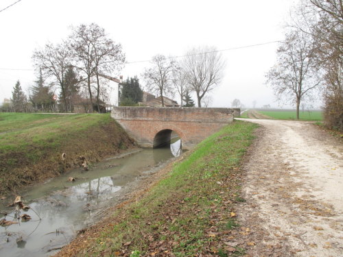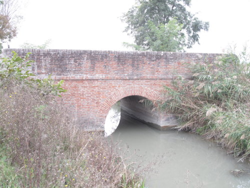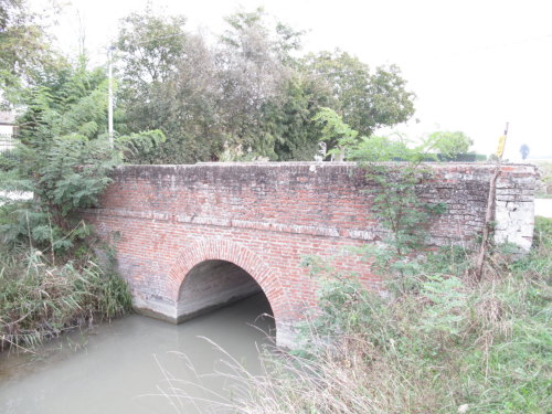 ponte in muratura continua a vista a canna ad arco a tutto sesto con parapetti pieni, pianta rettangolare con passaggio in terra.