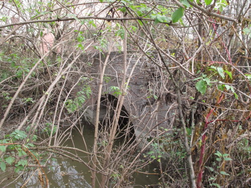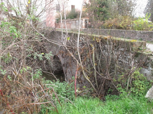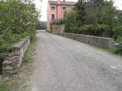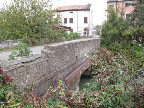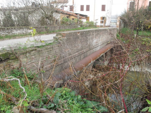ponte in muratura continua a vista a canna ad arco a tutto sesto, pianta rettangolare con passaggio asfaltato e parapetti pieni in muratura.