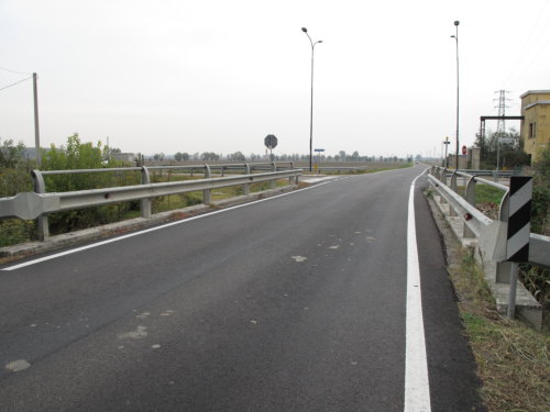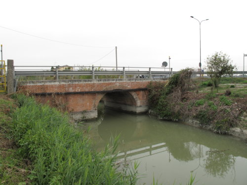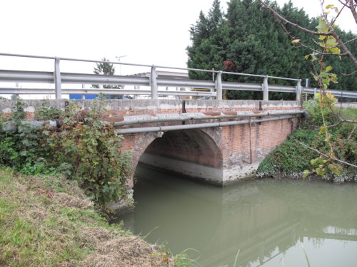 ponte in muratura continua a vista a canna ad arco a tutto sesto con parapetti in ferro, pianta rettangolare con passaggio asfaltato.