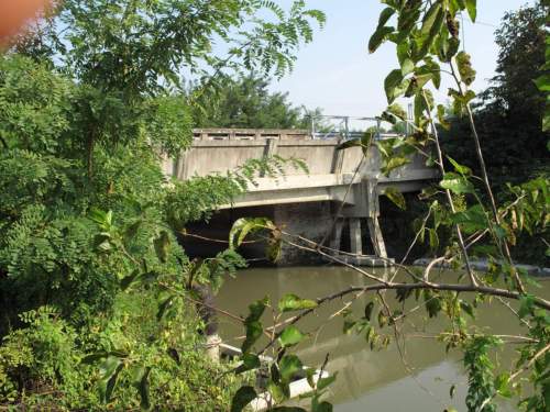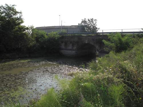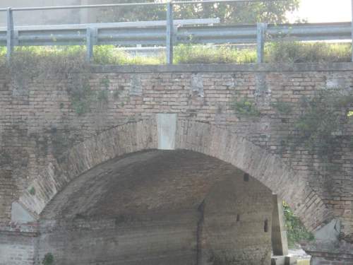 ponte in muratura continua a vista a canna ad arco a tutto sesto con parapetti misti in ferro e muratura piena, in parte provvisti di guardrail, pianta rettangolare con passaggio asfaltato. Presenza di struttura per aumento della sezione minore in cemento armato.